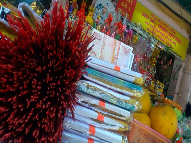 | Tiền lẻ được đổi công khai trước cổng chùa Hà và bán kèm với đồng lễ. |