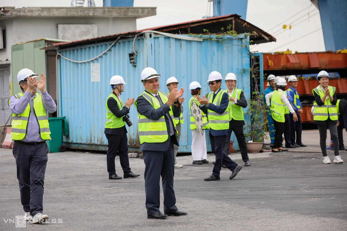 Các chuyên gia, kỹ sư vỗ tay chúc mừng toa tàu đầu tiên được dỡ xuống xe siêu trường siêu trọng an toàn.