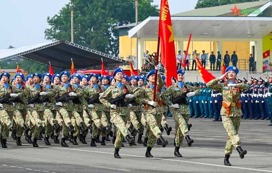 | Đồng chí Nhữ Thị Hà, công nhân Phân xưởng Sàng tuyển, tham gia trong hàng ngũ nữ quân nhân thuộc Khối lực lượng gìn giữ hòa bình LHQ diễu binh Kỷ niệm 50 năm Ngày Giải phóng miền Nam. |