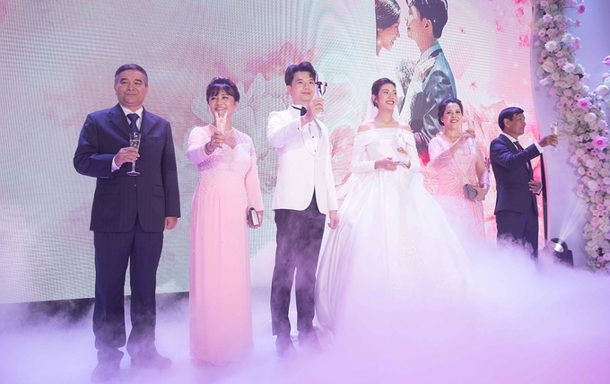 | Gia đình hai bên Thúy Vân và Hoàng Nhật nâng ly trong buổi lễ cưới. Tại buổi tiệc, bà Hoàng Thị Vĩnh Hảo - mẹ chồng Thúy Vân - xúc động nói: "Mẹ sẽ dành mọi thời gian để chăm sóc cho gia đình nhỏ của con, nhất là cháu nội của mẹ". Còn mẹ ruột Thúy Vân cũng mong cả hai sẽ yêu thương nhau đến suốt cuộc đời. |