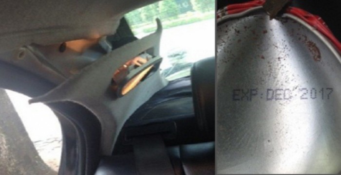 | Bình cứu hỏa còn hạn đến năm 2017 nổ tung, làm hỏng nội thất chiếc BMW sang trọng. |