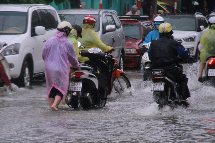 | Đến giờ tan tầm, nước tại các tuyến đường trên vẫn chưa có dấu hiệu rút. Trong ảnh là cảnh người dân bì bõm trên đường Núi Thành, đoạn gần giao với đường 30/4. |