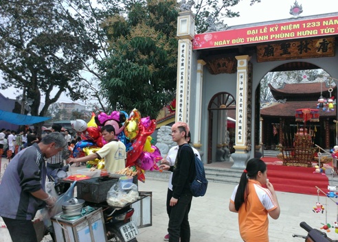 Ngay từ cổng đình là cảnh lộn xộn của hàng quán với đủ thứ hàng hóa như đồ ăn, gấu bông, đồ lưu niệm được bày bán.