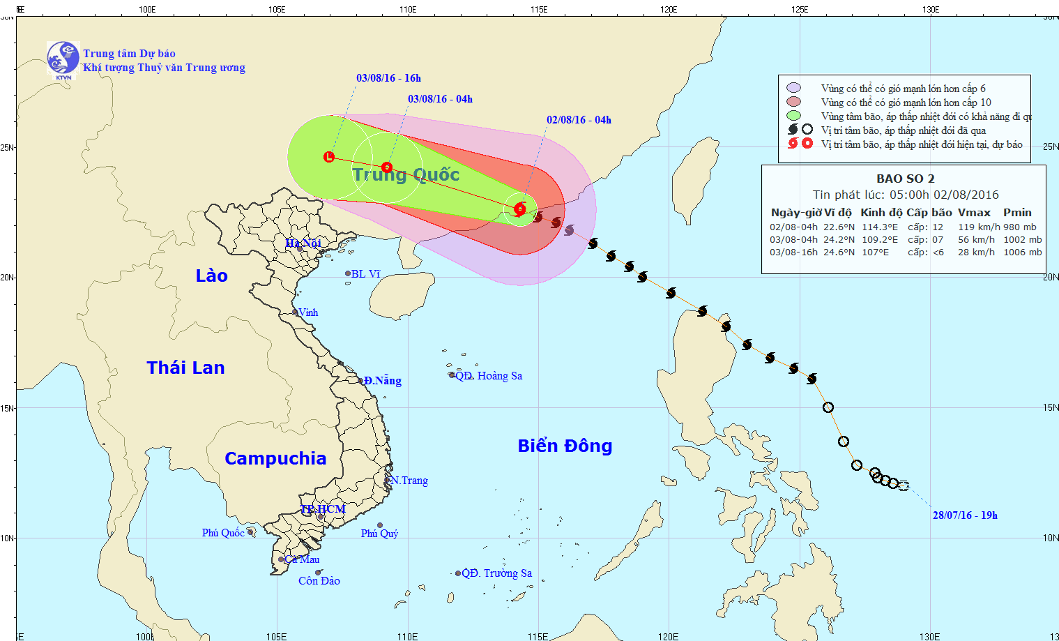 Khoảng 7h ngày 15/8, vị trí tâm bão ở vào khoảng 20,9 độ Vĩ Bắc; 112,0 độ Kinh Đông, trên vùng biển phía Nam tỉnh Quảng Đông (Trung Quốc), cách các tỉnh từ Quảng Ninh đến Nghệ An khoảng 500-600km về phía Đông. Sức gió mạnh nhất vùng gần tâm bão mạnh cấp 8-9 (60-90km/h), giật cấp 11.