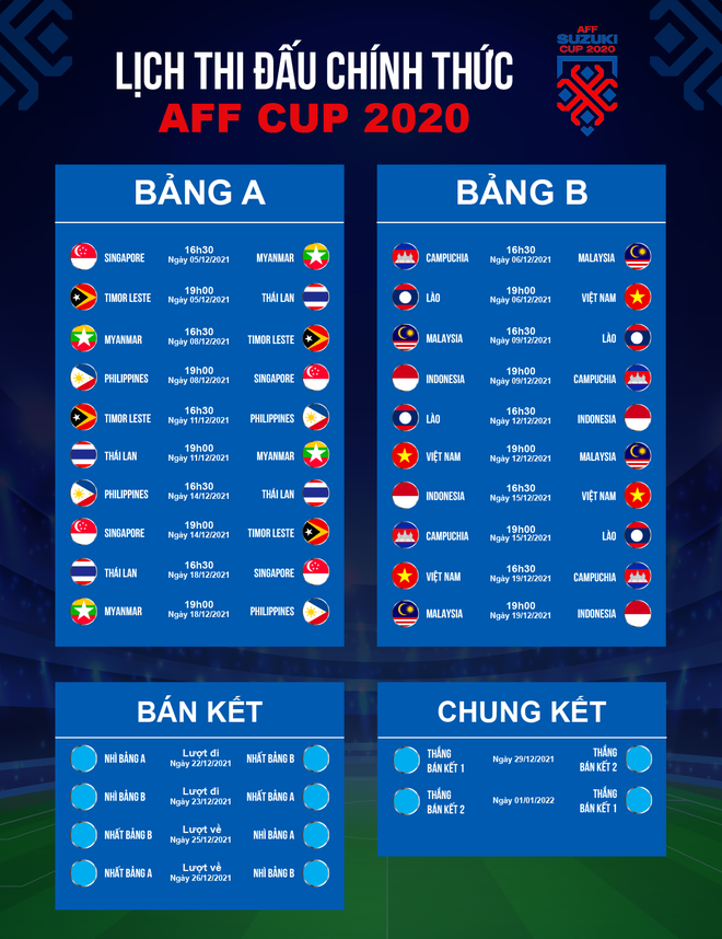 Kỳ AFF Cup 2020 sẽ diễn ra từ ngày 5/12/2021 đến ngày 1/1/2022. Giải đấu năm nay sẽ được tổ chức ở Singapore. Ở giải đấu này, đội tuyển Việt Nam nằm chung bảng với Malaysia, Indonesia, Lào và Campuchia. Chúng ta sẽ bắt đầu chiến dịch AFF Cup bằng trận ra quân gặp Lào vào ngày 6/12.