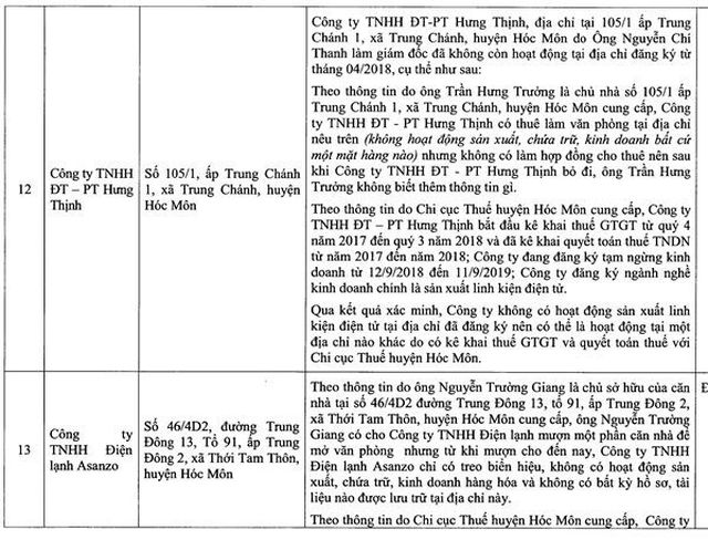 Ngoài ra, có 8 doanh nghiệp trong số 15 doanh nghiệp đăng ký kinh doanh có liên quan tới Asanzo đã giao cho Đội quản lý thị trường thẩm tra, xác minh với kết quả dưới đây. Còn lại 23 doanh nghiệp vẫn đang tiếp tục được xác minh.