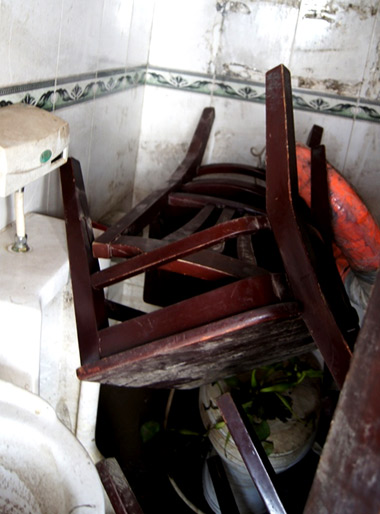 | Bàn ghế bị xô đẩy vào cả trong phòng toilet. |