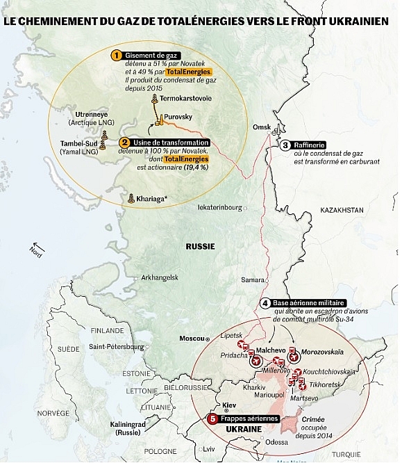 TotalEnergies đã phải chịu áp lực kể từ khi Le Monde công bố cuộc điều tra vào hôm thứ Tư, dựa trên các tài liệu và cuộc điều tra do tổ chức phi chính phủ Global Witness thực hiện, cáo buộc khí ngưng tụ khai thác từm ỏ Termokarstovoie đã được sử dụng để cung cấp cho các máy bay chiến đấu của Nga tham chiến ở Ukraine. Sáng thứ Sáu, nhóm Pháp đã công bố các yếu tố từ Novatek để đảm bảo rằng nhiên liệu này không được dùng cho mục đích trên.