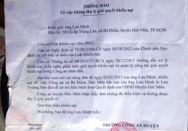 Ngày 28/2/2015, Công an huyện Hóc Môn đã có thông báo về việc không thụ lý giải quyết khiếu nại của ông Lưu Minh. Thông báo do Đại tá Nguyễn Văn Đạt, Trưởng Công an huyện ký nêu rõ: Sau khi xem xét nội dung đơn khiếu nại ngày 2/2/2015 của ông Lưu Minh về việc Công an xã Bà Điểm (huyện Hóc Môn) bắt Lưu Trường Sơn đưa đi cơ sở chữa bệnh theo quyết định của UBND huyện Hóc Môn, Công an huyện Hóc Môn nhận thấy đơn không đủ điều kiện và không được thụ lý giải quyết.
