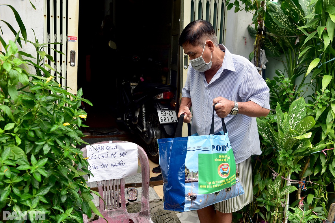 Nhận phần quà từ tay bộ đội, ông Nguyễn Đình Tỵ (68 tuổi) không thể cầm được nước mắt vì xúc động. "Nhà tôi chỉ có 2 vợ chồng và đứa con trai, mấy tháng liền thất nghiệp rồi, sắp không trụ được nữa. Khi biết tin bộ đội đến trao quà, tôi viết vội tấm bảng với mong muốn dành lời cảm ơn đến họ không ngại khó ngại khổ để hỗ trợ nhân dân", ông Tỵ xúc động nói.