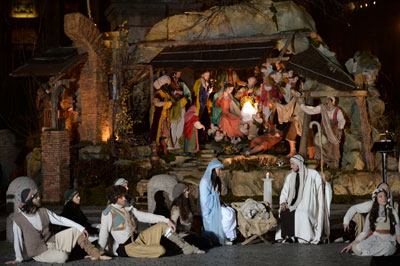 Hoạt cảnh Chúa Giáng Sinh trong buổi lễ ra mắt của hang đá tại quảng trường Thánh Phêrô tại Vatican, ngày 24/12/2013, trong lúc Đức Giáo Hoàng Phanxicô đến thăm người tiền nhiệm Benedict XVI trong dịp chuẩn bị ăn mừng Giáng sinh đầu tiên của mình trong vai trò lãnh đạo của Giáo Hội
