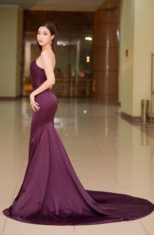 Với chiếc đầm màu đỏ Burgundy cùng thiết kế khoe vai trần của NTK Đỗ Long, Đỗ Mỹ Linh mang vẻ lôi cuốn và gợi cảm đến mê hoặc. Thiết kế ôm sát cũng giúp nàng hậu 9x khoe trọn những đường cong cuốn hút của cơ thể. Cô “đốn tim” toàn bộ khán giả có mặt tại sự kiện bởi thần thái “sang chảnh” nhưng lại rất thân thiện, gần gũi với mọi người.