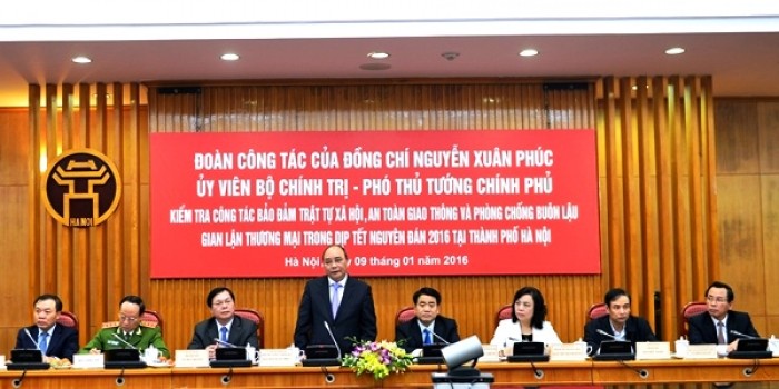 Chiều 9/1, Phó Thủ tướng Nguyễn Xuân Phúc - Trưởng Ban chỉ đạo quốc gia chống buôn lậu, gian lận thương mại và hàng giả đã có buổi làm việc với thành phố Hà Nội về công tác công tác chống buôn lậu, hàng giả, gian lận thương mại và cung ứng hàng hóa trong dịp Tết Bính Thân 2016.