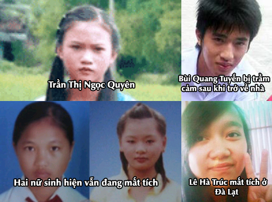 Cũng trở về sau khi “mất tích” và trở nên lầm lì là Bùi Quang Tuyến, học sinh lớp 12A2 Trường THPT Ninh Giang. Sau nửa tháng biến mất, Tuyến trở về với biểu hiện lầm lì, ít nói và không chia sẻ các thông tin liên quan. Công an Ninh Giang khẳng định không có chuyện học sinh Bùi Quang Tuyến bị bắt cóc như dư luận phỏng đoán. Còn Trần Thị Ngọc Quyên – học sinh lớp 10A3, Trường THPT Tam Quan, Hoài Nhơn, Bình Định, bỗng nhiên bỏ học đi Quy Nhơn rồi vào khách sạn ở nhờ. Bà chủ khách sạn này cho biết, cách đây gần một tháng, có một người quen làm việc ở gần bến xe khách trung tâm Quy Nhơn dẫn Quyên đến, nói cho Quyên ở nhờ. Bà nhiều lần gặng hỏi, Quyên nói là bị dì ghẻ đánh nên bỏ đi, chứ không cho biết cha mẹ là ai, ở đâu. Đọc thấy thông tin tìm Quyên trên một số tờ báo, bà đã báo tin cho gia đình Quyên biết. Khi về nhà, Quyên chỉ cho biết, có người đã đưa em vào TP Quy Nhơn, nhưng không nói cụ thể là ai và trở nên trầm lặng. Không chỉ có nữ sinh, nam sinh Trương Phùng Hiểu (14 tuổi), ở huyện Hoài Nhơn (Bình Định), học sinh lớp 8A2, Trường THCS Hoài Phú cũng mất tích bí ẩn. Rồi 1 tháng sau, Hiểu được tìm thấy trong quán cơm ở Quảng Nam, với biểu hiện tâm lý không ổn định.