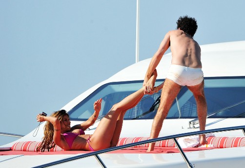 Đại gia Aladeen và siêu mẫu Elisabetta Canalis bị phát hiện “tình cờ” đi chung trên một du thuyền sang trọng trước khách sạn Hotel Du Cap trong LHP Cannes lần thứ 65 ngày 16.5.2012. Họ đã có những cử chỉ như thế này. - Ảnh: Getty