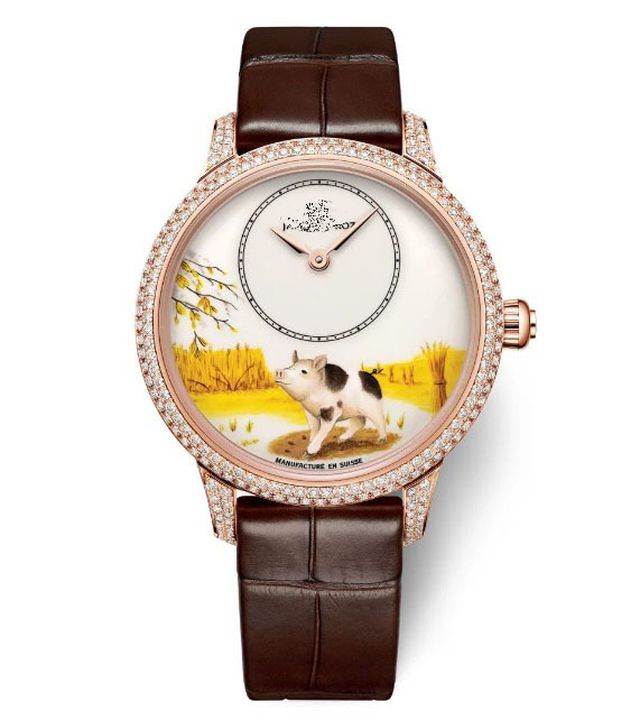 Một thương hiệu đồng hồ nổi tiếng của Thụy Sĩ tung ra hai mẫu đồng hồ đón năm Kỷ Hợi, mỗi mẫu sản xuất giới hạn 28 chiếc. Mẫu thứ nhất dành cho nữ giới, đưa cả một bức tranh mini vào mặt đồng hồ, trong đó, nhân vật chính là một chú lợn vui vẻ tản bộ trên cánh đồng lúa mì. Hình ảnh chú lợn trên mặt đồng hồ được vẽ tay thủ công. Phiên bản này có đính 232 viên kim cương li ti.