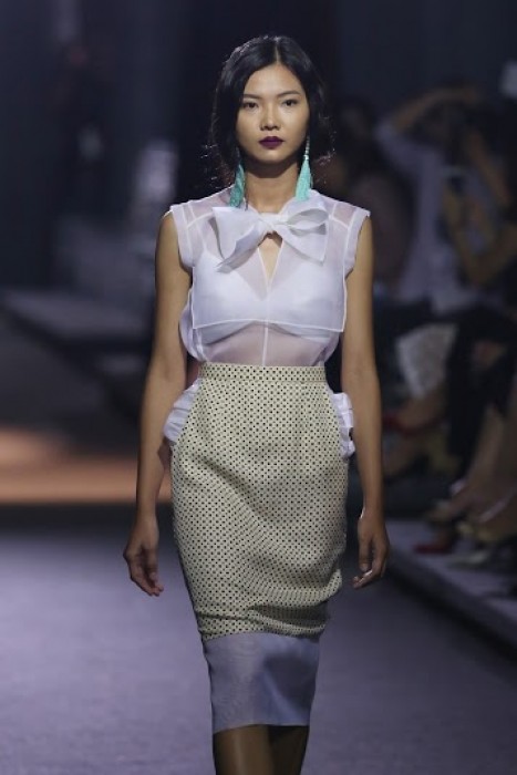 | Vẻ đẹp mong manh và thần thái của người phụ nữ Đông Dương được nhà thiết kế gửi gắm vào tác phẩm của mình qua chất liệu mượt mà, sang trọng, của vải satin, cá tính trong suốt của voan chiffon, oganza, vải cotton lạnh Ai Cập và sự tươi mới của phong cách trung tính - gam màu đậm và chất liệu vải gabardine mùa hè. |