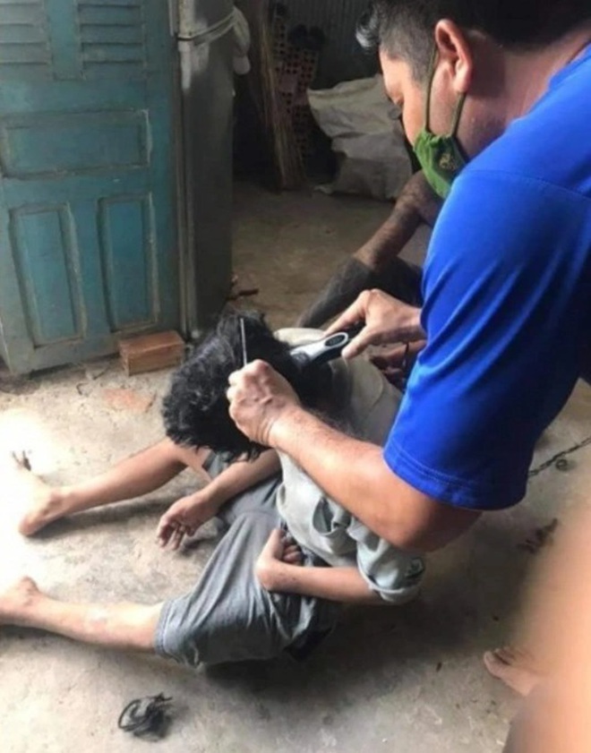 | Đại úy Thạch Bình vào khu phong tỏa cắt tóc cho dân. |