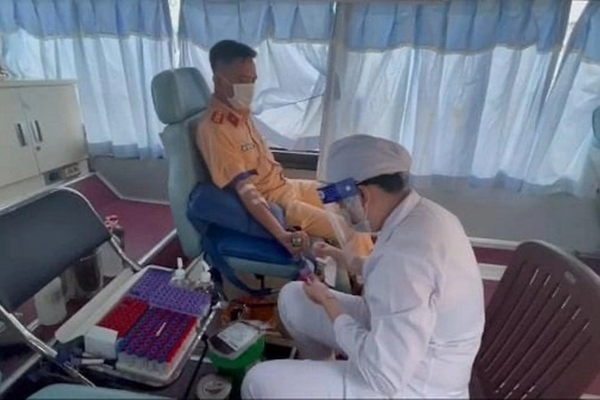 | Thiếu tá Nguyễn Việt Khởi, Phó Đội trưởng Đội đăng ký, Phòng CSGT đường bộ đường sắt Công an TP Cần Thơ hiến máu cứu người. |