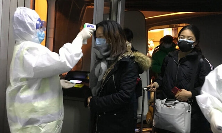 | Nhân viên y tế kiểm tra thân nhiệt của hành khách tới Vũ Hán ngày 22/1. Ảnh: AP. |