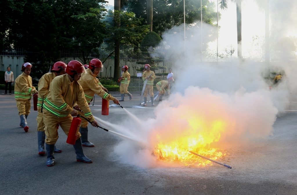 | Lực lượng nhân viên bảo vệ tòa nhà dùng bình cứu hỏa dập lửa |