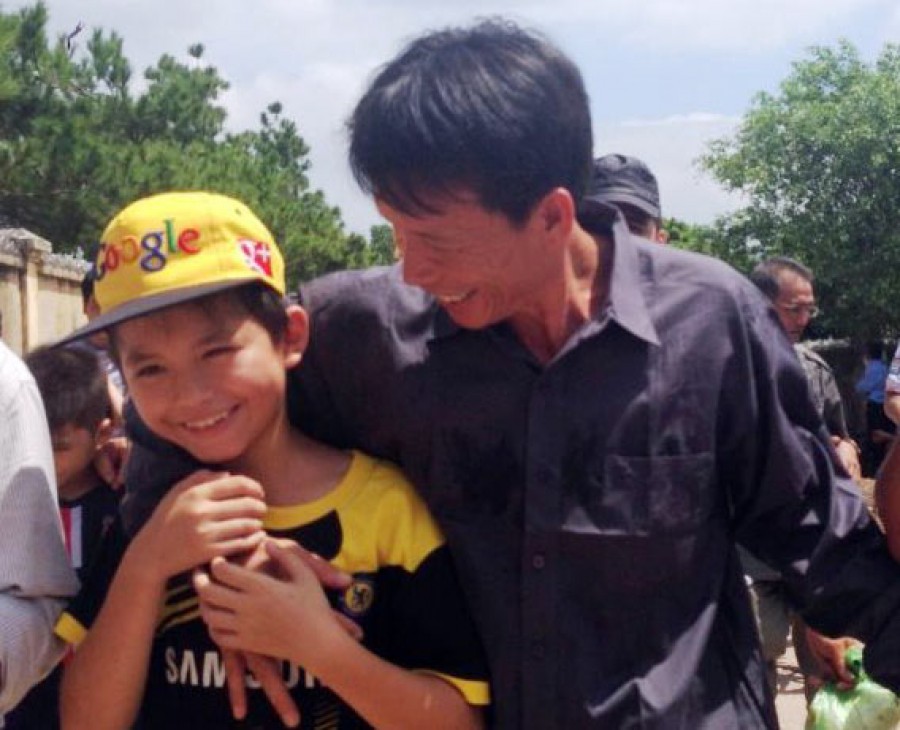 | Ông Đoàn Văn Vươn bên con trai của mình. |