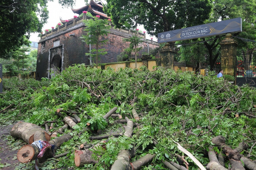 | Hàng loạt cây đổ rạp xuống vỉa hè trước cổng vào phía Bắc khu Hoàng thành Thăng Long khiến việc tham quan trở bị đình trệ, theo lời anh Duy bảo vệ tại khu vực cho biết việc cây đổ đã gây thiệt hại không nhỏ |