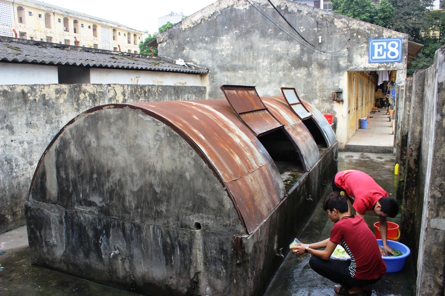 Nhiều người cũng phàn nàn về khu vệ sinh chung của Ký túc xá. Hai dãy nhà E7, E8 chung nhau bể nước, bốn nhà vệ sinh và hai nhà tắm. Các bạn sinh viên ngoài dùng nguồn nước đó nấu nướng, còn phải sử dụng làm khu tắm giặt chung. Cứ độ khoảng 5 – 7 giờ tối tại đây luôn chật cứng người, mùa đông còn đỡ chứ vào mùa hè có nhiều bạn phải đợi rất lâu mới đến lượt mình để tắm.