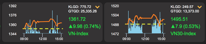 Tuy nhiên, điểm tích cực là về cuối phiên các chỉ số vẫn lấy lại được đà tăng. Đóng cửa, VN-Index tăng 9,98 điểm tương ứng 0,74% lên 1.361,72 điểm; HNX-Index tăng 2,32 điểm tương ứng 0,73% lên 319,01 điểm. Còn UPCoM-Index dừng tại sát ngưỡng tham chiếu, giảm 0,11 điểm tương ứng 0,12% còn 88,83 điểm.