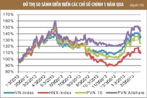 Thống kê diễn biến của các DN thuộc họ dầu khí cũng cho thấy một thông số ấn tượng: dù diễn biến gần tương đồng với thị trường, nhưng 1 năm qua (tính đến 28/2/2013), chỉ số PVNallshare (chỉ số giá toàn bộ 32 DN thuộc họ dầu khí đang niêm yết) đã tăng 44,42%, trong khi VN-Index tăng 35,59%, HNX-Index tăng 10,16%.