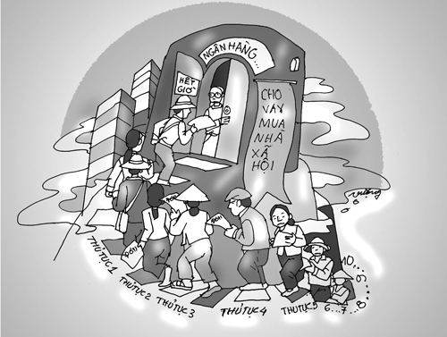 Mấy tuần lễ nay, người có nhu cầu vay vốn mua nhà đã phải lo chạy qua nhiều “cửa” để có được trên dưới khoảng 10 loại giấy tờ như: Hợp đồng mua nhà ở xã hội, giấy đề nghị vay vốn, giấy xác nhận của đơn vị công tác, giấy xác nhận của UBND phường hoặc xã về tình trạng nhà ở, hợp đồng lao động (phải còn thời hạn ít nhất 1 năm và đã công tác ít nhất 1 năm), bảng lương của cả vợ và chồng... Tuy nhiên, ở thời điểm hiện tại, dù có đủ những giấy tờ này rồi thì họ vẫn chưa thể tiếp cận nguồn vốn. Vấn đề này, các ngân hàng rất thông cảm với dân nhưng không thể giải quyết được mà vẫn phải còn chờ xem “chuẩn thấp” của Bộ Xây dựng như thế nào.