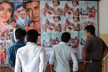 Những người đàn ông Bangladesh đang chăm chú theo dõi một tấm poster lớn quảng cáo phim “Common Gender” trên một con phố ở Thủ đô Dhaka.