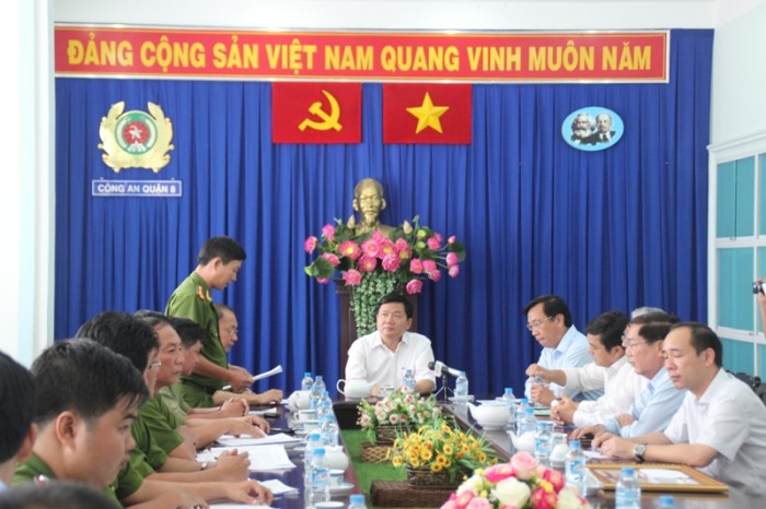 | Bí thư Thành ủy TP HCM Đinh La Thăng tại buổi làm việc với Công an quận 8. |