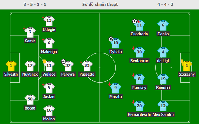HLV Allegri bố trí bộ hai cầu thủ Morata và Dybala thi đấu trên hàng công trong sơ đồ 4-4-2. Juan Cuadrado và Bernardeschi thi đấu ở hàng lang cánh. Ở bên kia chiến tuyến, Udinese ra sân với sơ đồ 3-5-1-1 với Pussetto đá cao nhất.