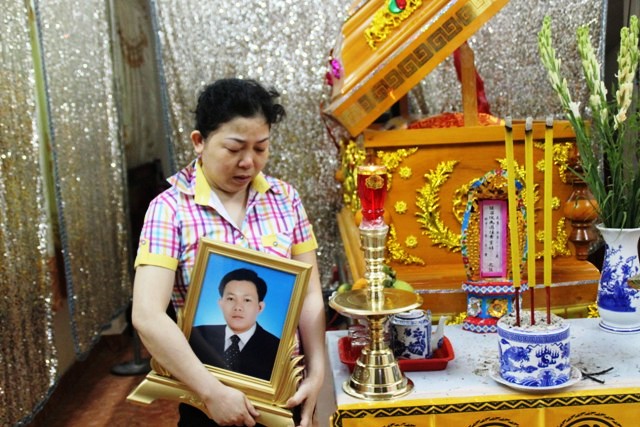 Vợ của nạn nhân ôm di ảnh chồng đứng trước quan tài.