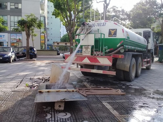 | Ban quản lý chung cư VP3 Linh Đàm phải sử dụng xe bồn để đưa nước vào bể chứa nước sinh hoạt của tòa nhà. |