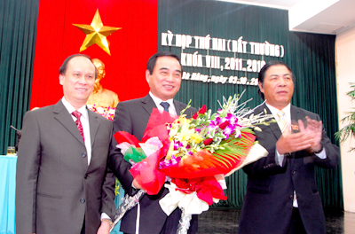 Tân Chủ tịch UBND thành phố Văn Hữu Chiến (giữa) nhận hoa chúc mừng của Phó ban Tổ chức Trung ương Trần Văn Minh (trái) và Bí thư Thành ủy Đà Nẵng Nguyễn Bá Thanh (phải).