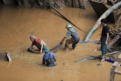 | Bên ngoài công nhân vẫn tiếp tục hút bùn. Ảnh: Gia Chính. |
