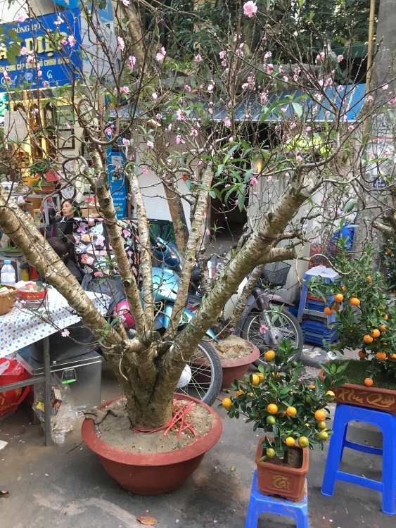 | Một gốc đào lâu năm nổi bật giữa khu chợ. |