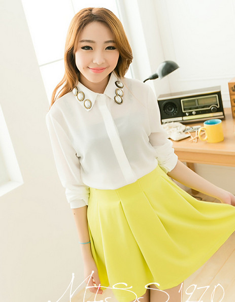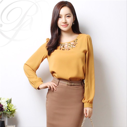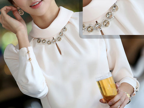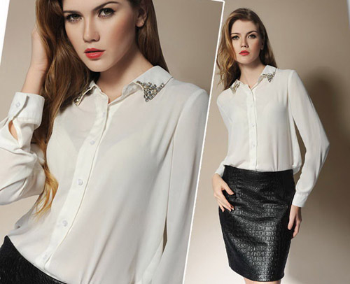 Những chiếc áo sơ mi đính đá ở cổ sẽ khiến các chị em nổi bật và điệu đàng hơn nơi công sở.