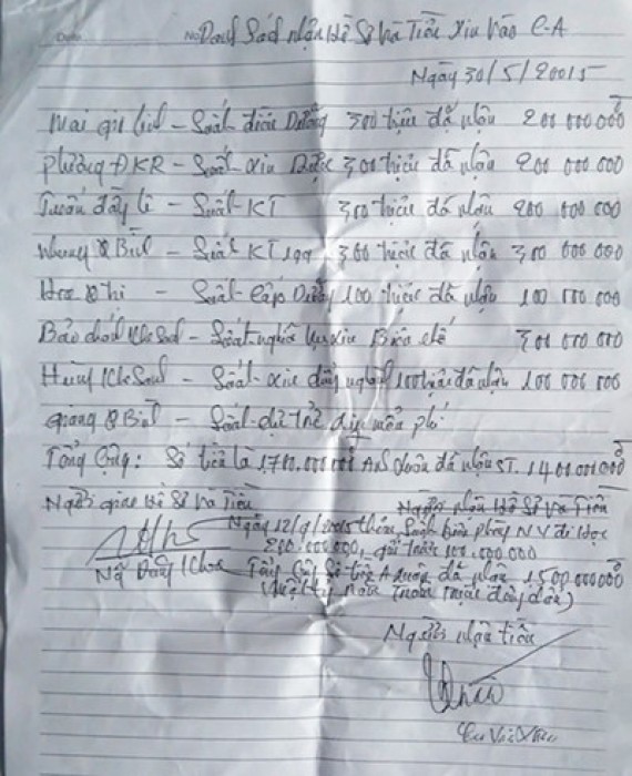 | Giấy nhận số tiền 1,5 tỉ đồng có chữ ký của Đại tá Cao Văn Xuân. |