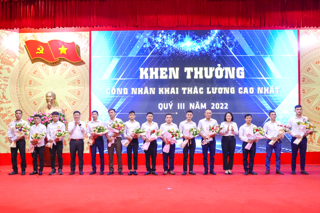 | Đoàn Văn Tiến (đứng thứ 8 từ trái sang) được khen thưởng công nhân khai thác lương cao nhất quý III năm 2022 |