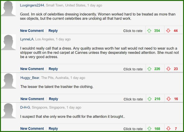 Độc giả LynnelA: “Tôi sẽ không gọi đó là một bộ váy. Bất cứ một nữ nghệ sĩ có năng lực nghệ thuật thực sự nào cũng sẽ không cần phải mặc một bộ đồ kiểu thoát y như thế để bước lên thảm đỏ ở Cannes, trừ phi họ quá thèm khát nhận được sự chú ý. Chắc cô gái này không phải một nữ diễn viên giỏi”.