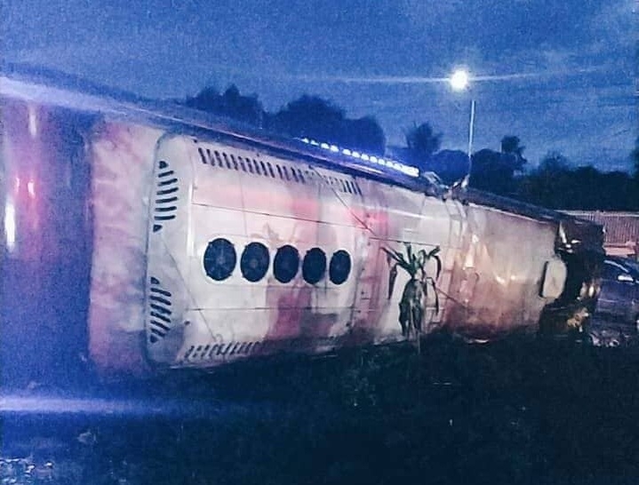 Đang lưu thông, xe khách bất ngờ gặp sự cố, lật ngang, đè trúng xe máy ven đường. Hai mẹ con hành khách là chị Đặng Thị Diệu (27 tuổi, quê xã Mỹ Lộc, huyện Phù Mỹ, Bình Định) và cháu Chung Đặng Nhã Hân (2 tuổi) bị văng ra bên ngoài tử vong tại chỗ. 17 hành khách khác trên xe bị thương đang được cấp cứu tại bệnh viện.