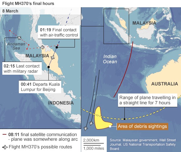 Lúc đầu, các tín hiệu ping - về cơ bản là tin báo "tôi vẫn hoạt động" - được dùng để lập ra hai vòng cung rộng, một về hướng bắc, một về hướng nam, chỉ ra đường bay có thể của máy bay.