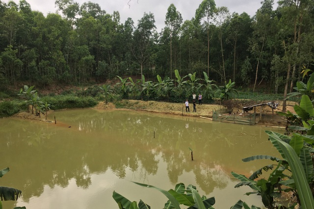 | Khu vực hồ cá của gia đình chị Huế sâu, nhiều chỗ đã bị đào lấy đất nên rất nguy hiểm. |