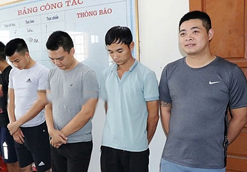 | Nghi can Nam (ngoài cùng bên phải) cùng các chân rết trong đường dây đánh bạc. Ảnh: Công an Hà Tĩnh |