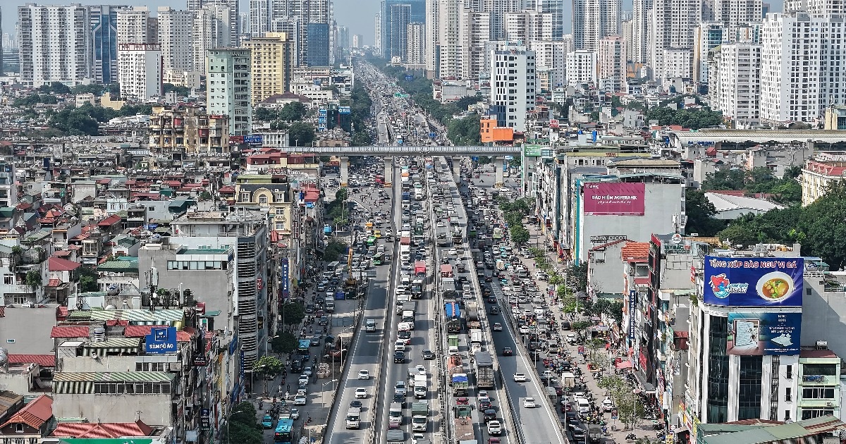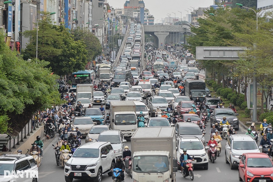 Ô tô xếp thành 5-6 hàng nối đuôi nhau trên Đại lộ Thăng Long.