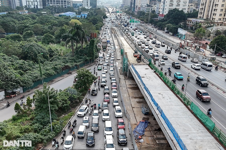 Nút giao Đại lộ Thăng Long đi Khuất Duy Tiến (quận Cầu Giấy, Hà Nội) chiều 20/1, mật độ phương tiện tăng cao, hàng trăm ô tô xếp hàng dài hơn 1km.