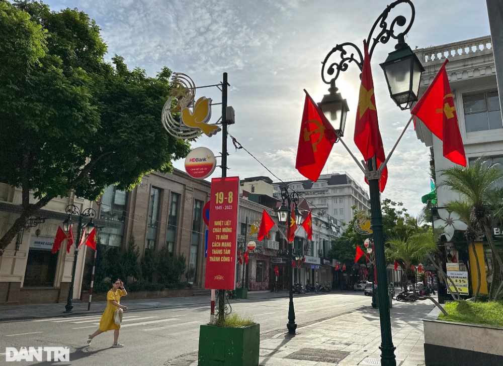 | Phố Tràng Tiền rực rỡ sắc cờ đỏ trong những ngày mùa thu tháng Tám. |